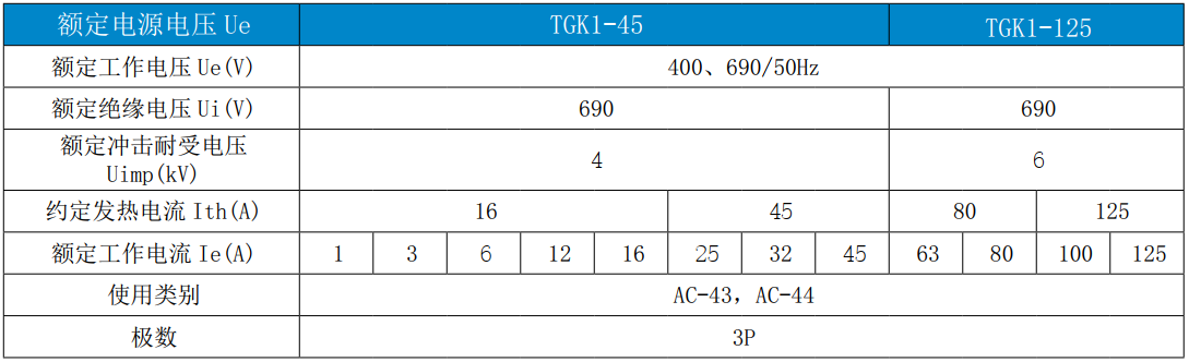 TGK1 系列控制與保護開關(guān)電器(CPS)( 以下簡稱“開關(guān)”),主要適用于交流50Hz(或60Hz)、額定工作電壓690V、額定工作電流 1A 至 125A、控制器整定電流 0.4A 至 125A、控制電機功率 0.12kW至 55kW 的電路中,能夠接通、承載和分?jǐn)嗾l件下 ( 包括規(guī)定的過載條件 ) 的電流,也能接通、承載一定時間和分?jǐn)嘁?guī)定的非正常條件下 ( 如短路 ) 的電流。